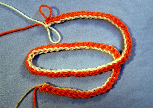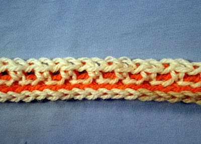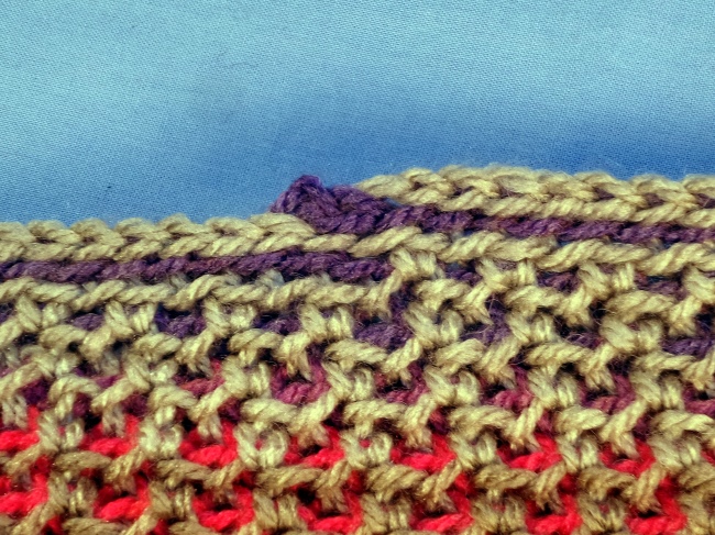 The whole item is then worked like this, in continuous rounds, one round of each colour, all the time with right side facing.