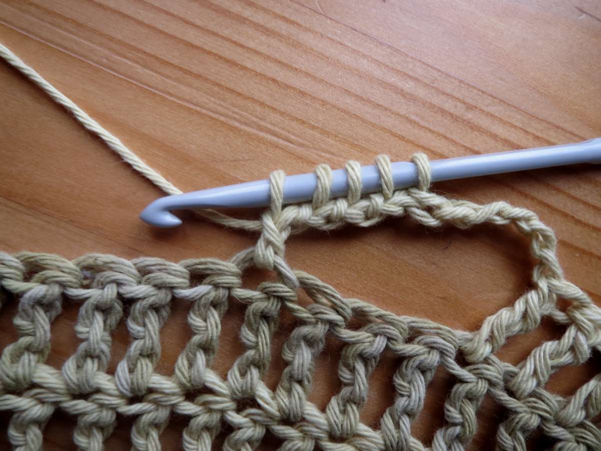 Virka en till länkad fyrdubbelstolpe, fem luftmaskor, hoppa över tre maskor, en dubbelstolpe.