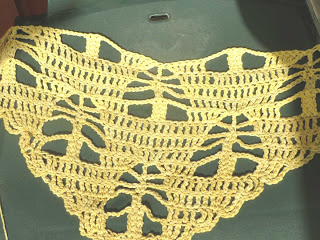 NU, långt senare, har jag kommit på hur den skulle kunna göras längre utan att bli ännu vidare. Det sista varvet skulle naturligtvis inte virkas runt hela som en poncho utan bara fram och bak, så att det bildas ärmar på sidorna. Nu har den blivit en spetströja!