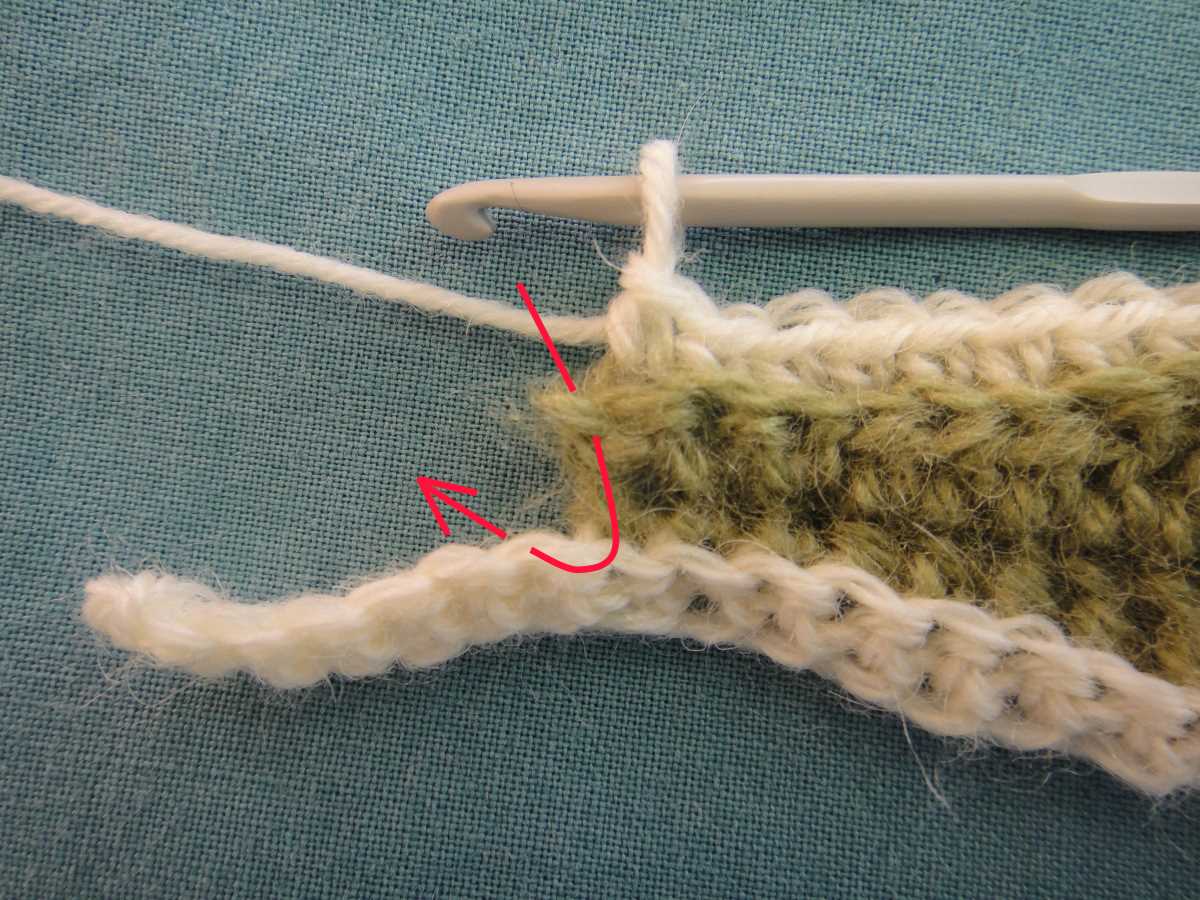 En närbild på hur det ser ut när man passerar stället där man vände med det gröna garnet: Här kommer momentet som jag kallar att länka i vändmaskan, som jag har använt i flera mönster och även visat tidigare. I det här fallet görs det så: stick nålen först genom vändmaskan från föregående varv (det är ganska trångt men det går), sedan genom maskan som ska virkas i, omslag och dra upp en ögla, nytt omslag och dra genom alla tre öglor på nålen.