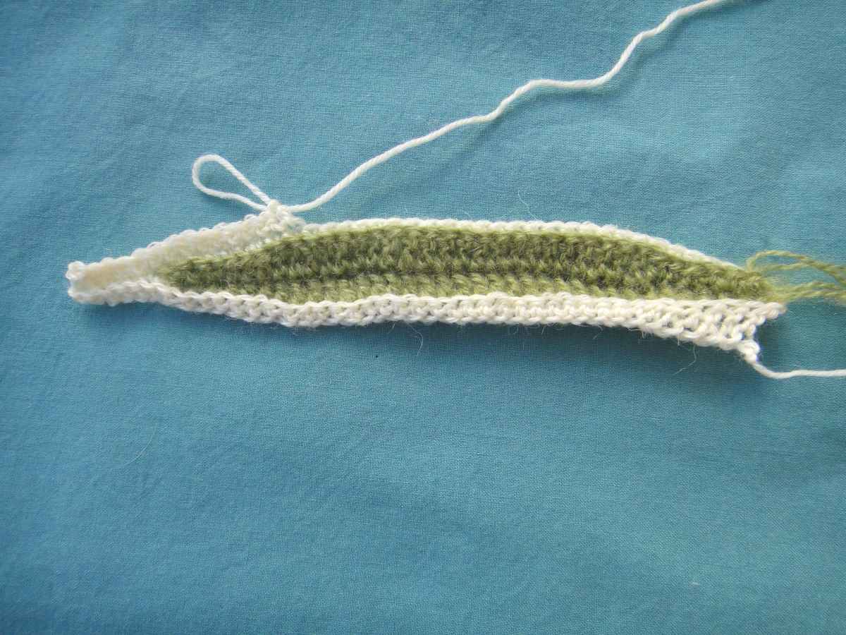 3 fm, 3 hst, 22 st, 3 hst, 3 fm, 1 vändluftmaska, vänd. Virka 3 fm, 3 hst, 22 st, 3 hst, 3 fm. Klipp av det gröna garnet.