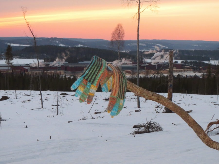 Så här har jag gjort: Först virkade jag fram och tillbaka till en rektangel (35 maskor, 50 varv). Ena halvan virkades i smygmaskor i bakre maskbågen (mudden) och den andra smygmaskor i främre maskbågen (handen). Sedan virkade jag ihop rektangeln till en cylinder, men lämnade en öppning över de mittersta 15 maskorna för tummen. Tummen och fingrarna virkades i rundvarv med smygmaskor i främre maskbågen. För att få tummen uppåt och inte rakt utåt minskade jag två maskor på varje varv mot mudd-sidan samtidigt som jag ökade en maska på motstående sida på varje varv, det gav både lutning och avsmalning. Fingrarna virkades också runt men utan avsmalning. För att placera fingrarna rätt tog jag på mig vantarna när jag fått dit tummen och markerade sedan var fingrarna skulle sitta. Det gjorde att tummen inte kom exakt på sidan utan sitter en bit in på vantens insida.