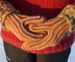 (Okej, jag vet, garnet användes bara till 50% av vantarna eftersom de är randiga och jag använde lika mycket av andra garner... Men ändå.)